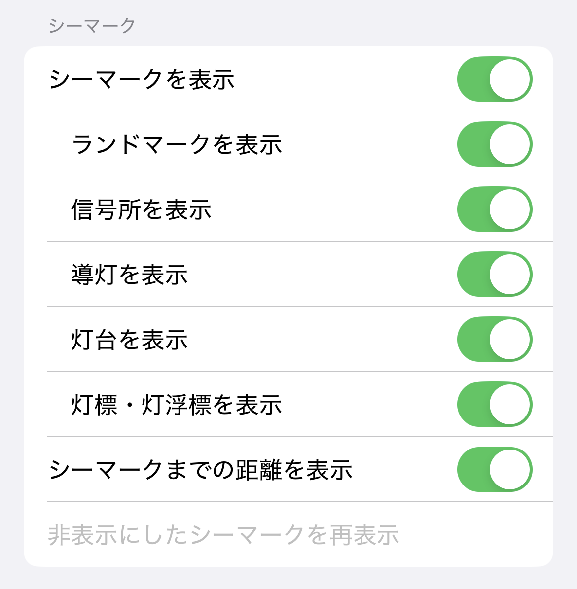 個別に非表示にしたすべてのシーマークの名前を再表示するには、アプリの設定画面の「非表示にしたシーマークを再表示」をタップします。 -