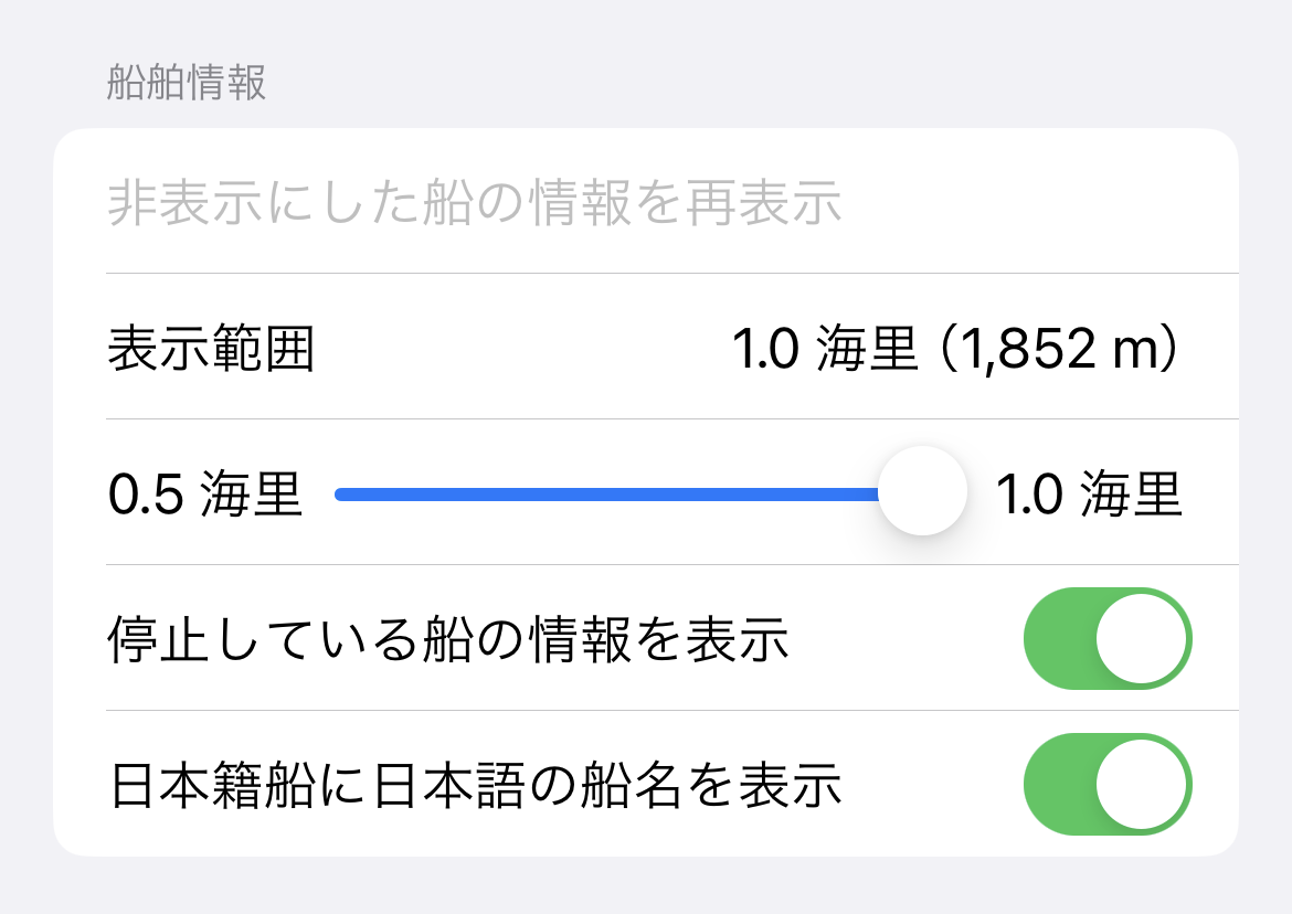 アプリの設定画面の「日本籍船に日本語の船名を表示」のスイッチで表示・非表示を切り替えることができます。- 日本語の船名がアルファベット表記の船があります。