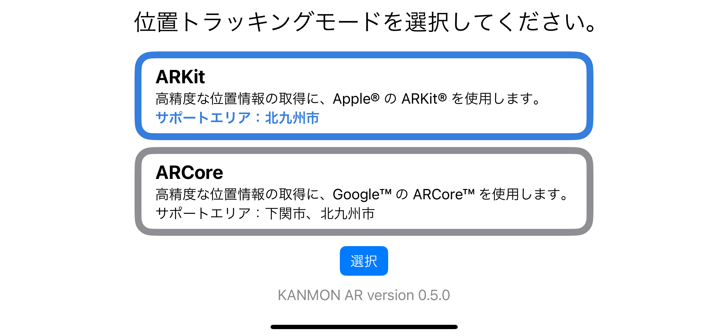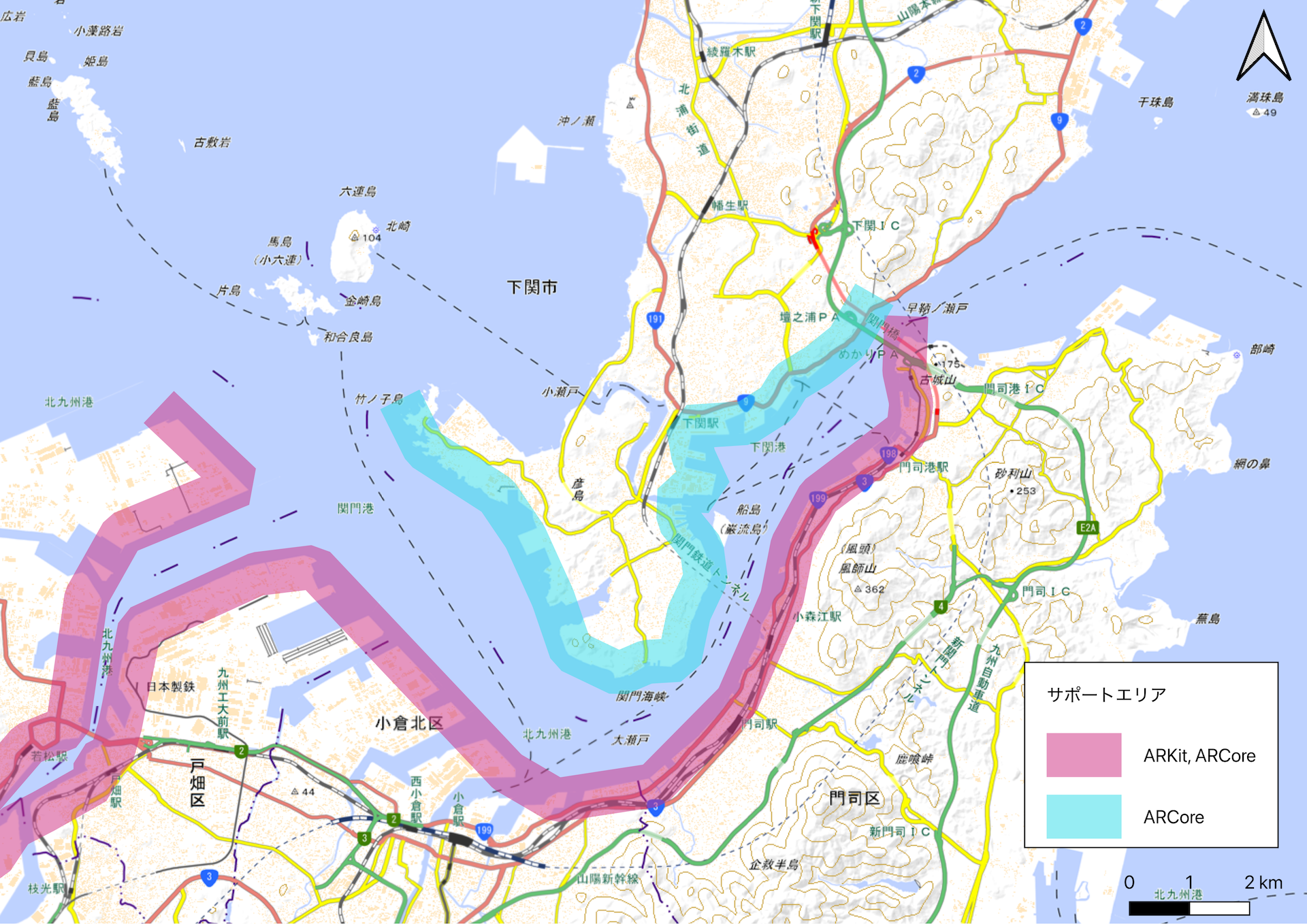 ARKit は北九州市、 ARCore は下関市、北九州市で使用できます。