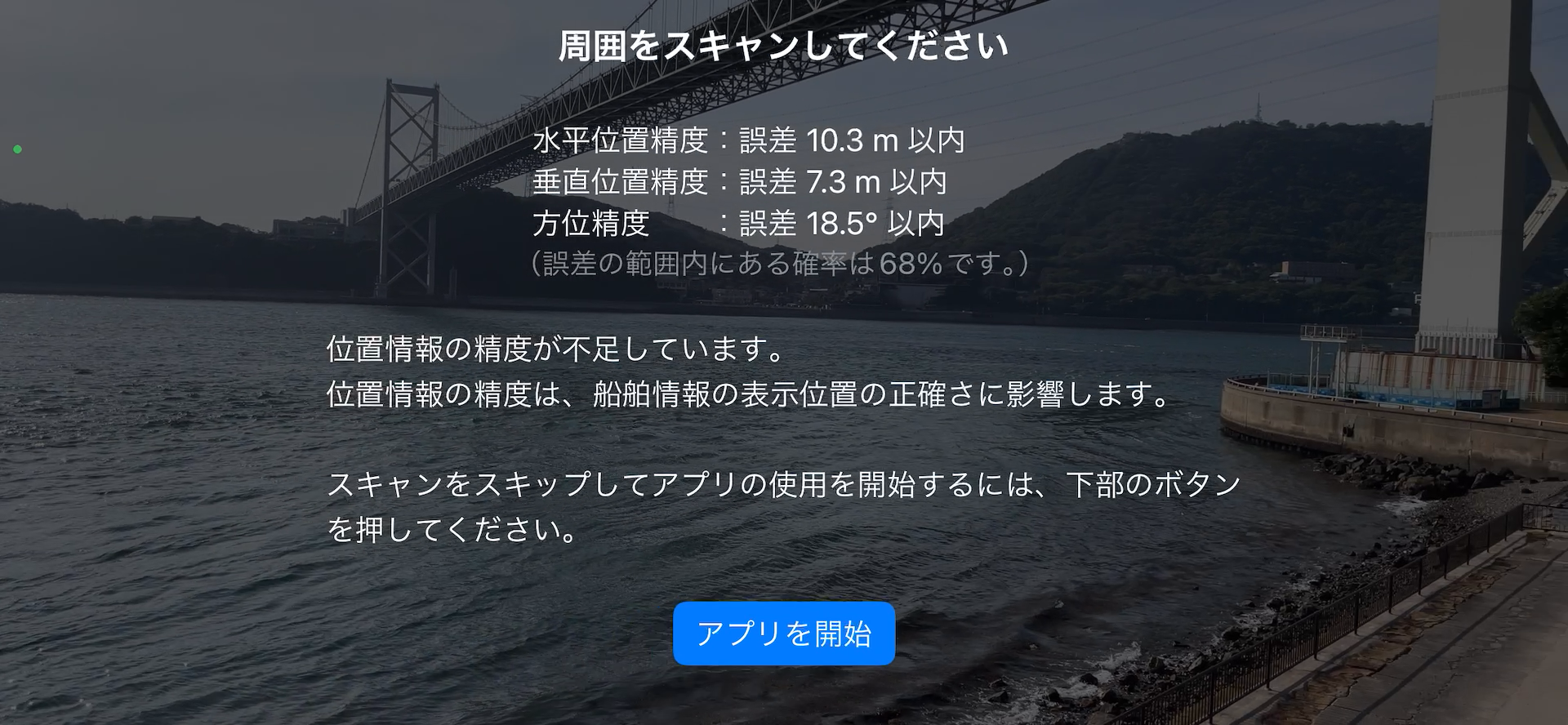 また、ARCore モードでは、スキャンをスキップしてアプリの使用を開始することができますが、船舶情報・シーマークが正確な位置に表示されない可能性が大きいです。